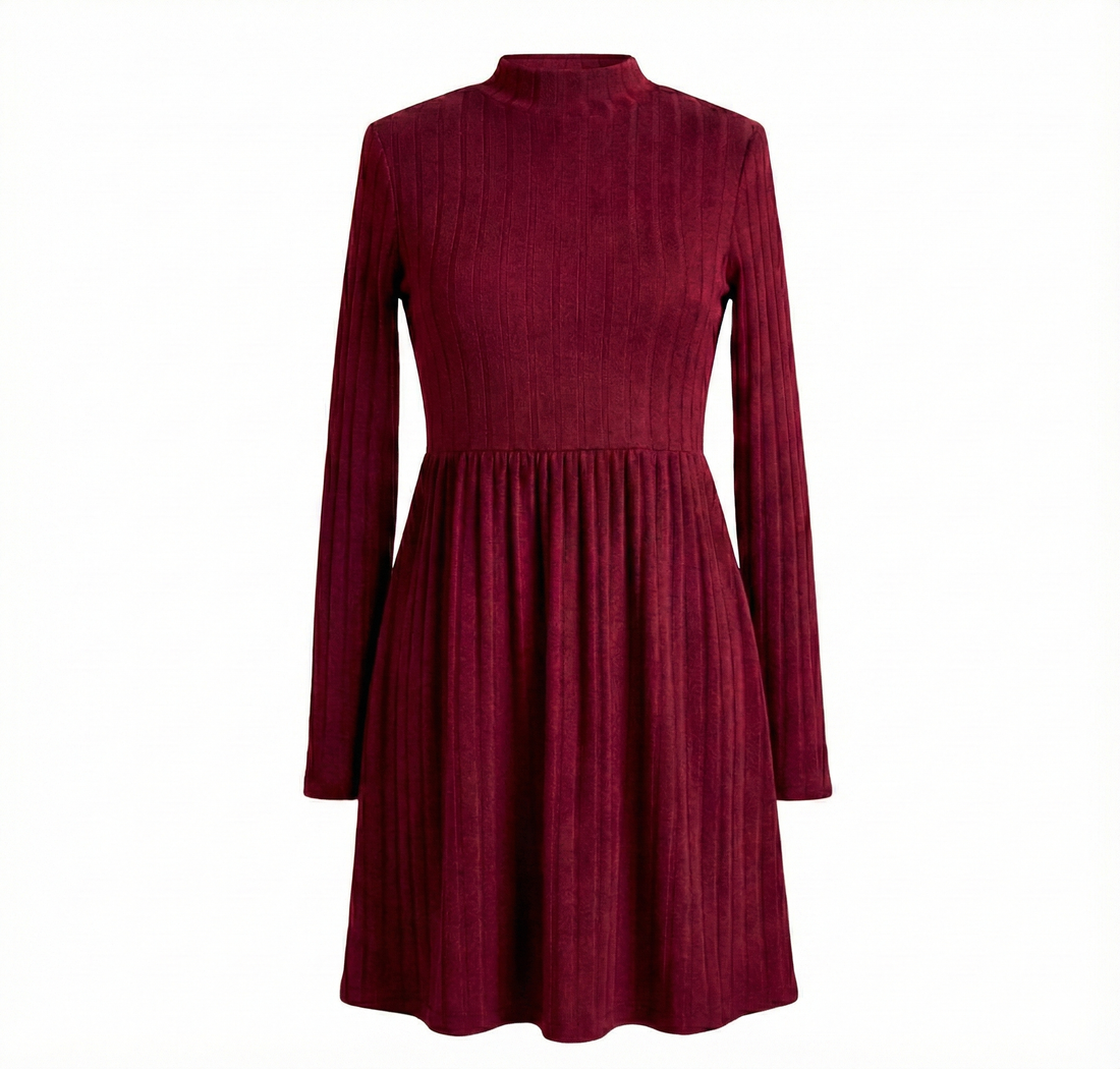 Frilled Neck Ribbed Knit Patchwork Long Sleeve Mini Dress